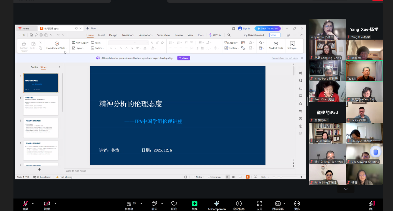 IPA中国学组举办伦理研讨会 ——"伦理态度" 2025年12月6日,IPA 中国学组伦理委员会组织的伦理研讨会。会上林涛博士围绕"伦理态度"这一主题作了专题讲座,探讨了精神分析实践中伦理的本质意义与相关问题。伦理在精神分析实践中并不仅限于技术层面的考量,而涉及更为根本的专业态度。 在此基础上,林涛博士概述了伦理态度的基本内涵,并从元层面探讨了伦理态度与分析技术、分析态度之间的内在关联。进而探讨了伦理实践既涉及制度与规则,也关乎分析师自身态度的深层转化。 最后,林涛博士将伦理问题置于更广